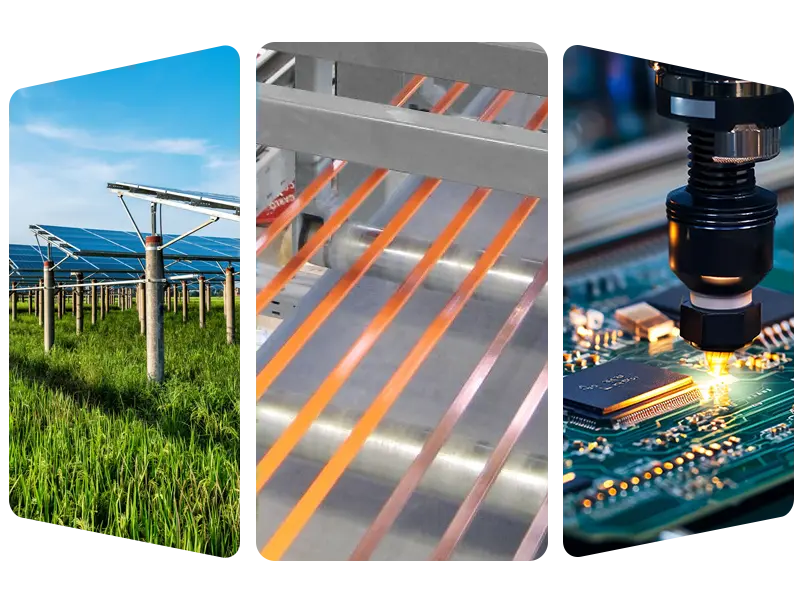 • médan Photovoltaic: produksi masal pita las photovoltaic jeung busbars pikeun mantuan komponén ngalirkeun listrik éfisién.